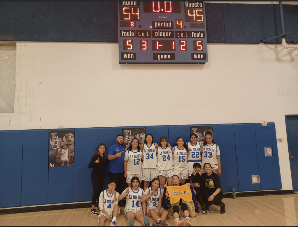 The 2024-2025 La Mirada High girls basketball team will be one for the ages as its 54-45 win over Dominguez High last Friday clinched at least a share of the Mid-Cities League title. It’s presumed to be the first league championship for the program in school history, at least in 40 years. PHOTO BY LOREN KOPFF.